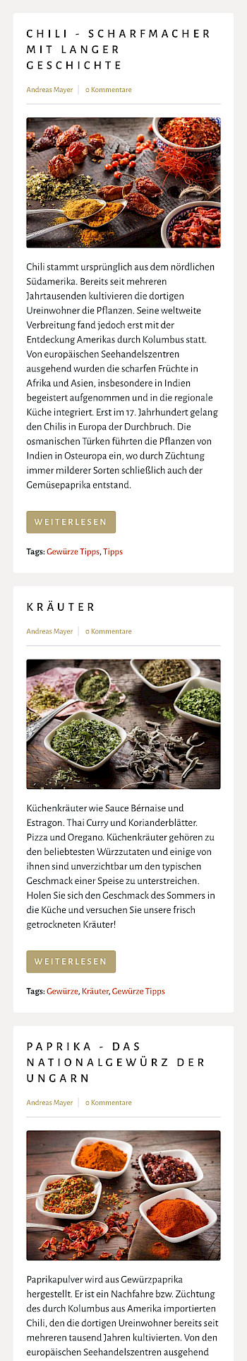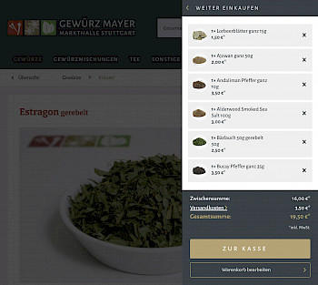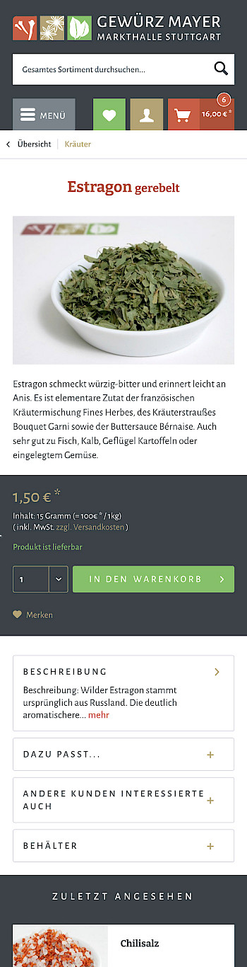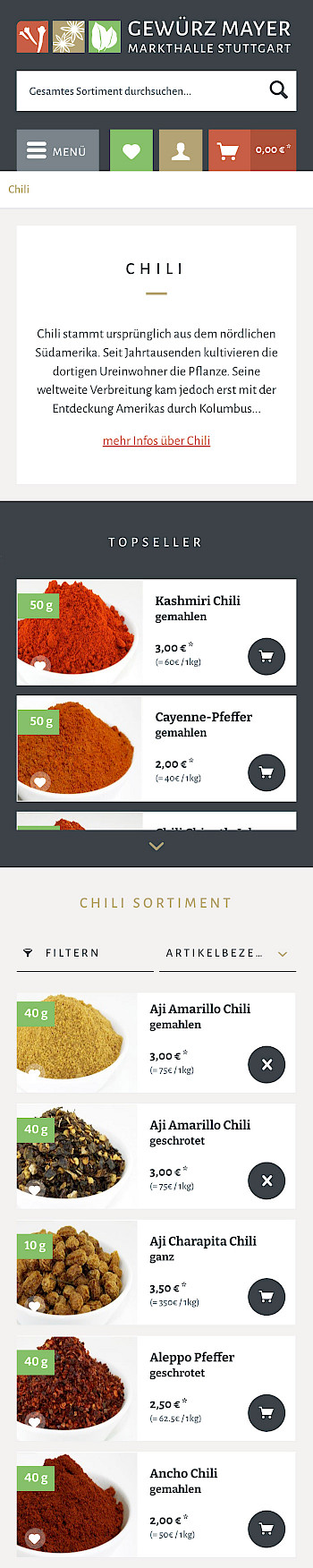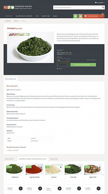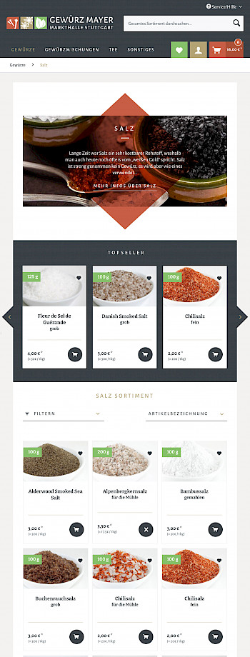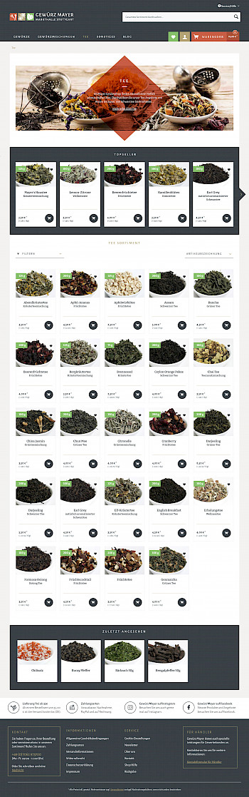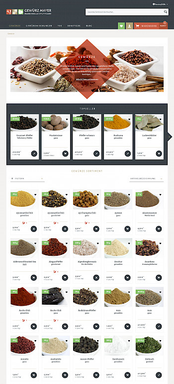 Mit dem Umstieg auf die Shopware Plattform realisierte ich ein Redesign in Figma. Der Fokus lag hier auf einem aufgeräumten und ansprechend dargestellten Sortiment. Dem Besucher soll einerseits das Stöbern im großen Sortiment Spaß machen, andererseits soll auch das gezielte Filtern und Suchen der Produkte schnell zum Ziel führen. Gut geplante Gestaltung und umfangreiche Templatearbeiten bildeten das Grundgerüst für eine neue Gewürz Mayer Shopping-Erfahrung.