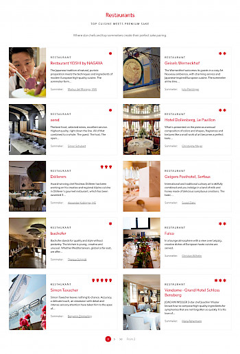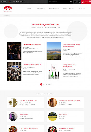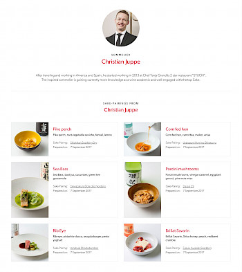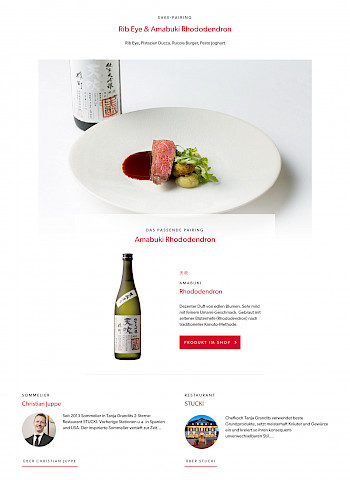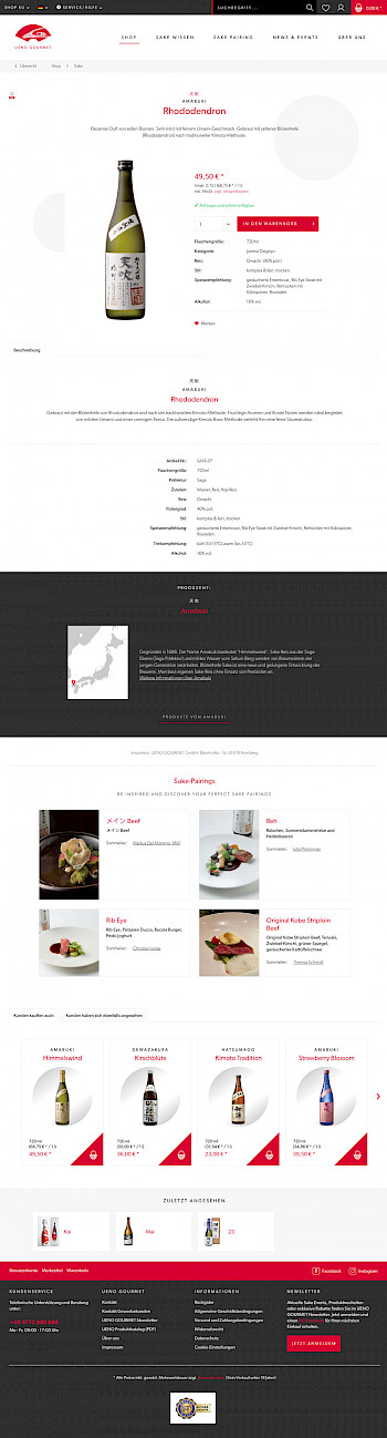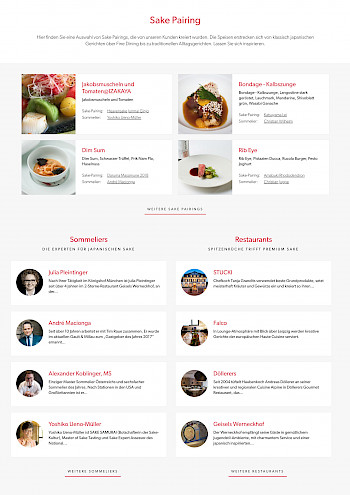 UENO Gourmet macht einen Großteil des Umsatzes im Handel mit der Spitzengastronomie. Für diese Zielgruppe wurden verschiedene Inhalte integriert, wie z.B. Sake-Pairings, Inhaltsseiten mit der Vorstellung eines Gerichtes mit passender Empfehlung eines Sakes. Diese Sake Pairings wurden von Sake Sommeliers entworfen, welche ebenfalls mit den Sterne-Restaurants vorgestellt werden. Zusätzliche Übersicht- und Inhaltsseiten wurden also eingepflegt für die Sake-Pairings, die Sommeliers und Restaurants. Über die Shopware Funktion "Inhaltstypen" wurden diverse Inhalte entworfen und deren Inhalte an verschiedenen Stellen über die API geladen. So werden z.B. Sake-Pairings passend zum Sake auf der Produkt-Detailseite geladen. Auch Veranstaltungen wurden über die Funktion Inhaltstypen integriert und an verschiedenen Stellen in den Templates geladen über die API.